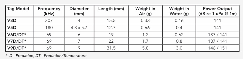 Los transmisores de depredación vienen en una variedad de tamaños (V3D, V5D, V7D y V9D) y frecuencias de transmisión (69/180/307 kHz), siendo compatibles con los receptores VR2W, HR2y el nuevo HR3.